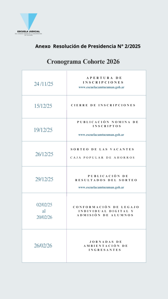 Modo de Adjudicación de las Vacantes Las vacantes serán asignadas mediante sorteo público, que se llevará a cabo en la Caja Popular de Ahorros de la Provincia de Tucumán. La lista de aspirantes sorteados por cada sede se exhibirá y publicará en la página web de la Escuela Judicial.